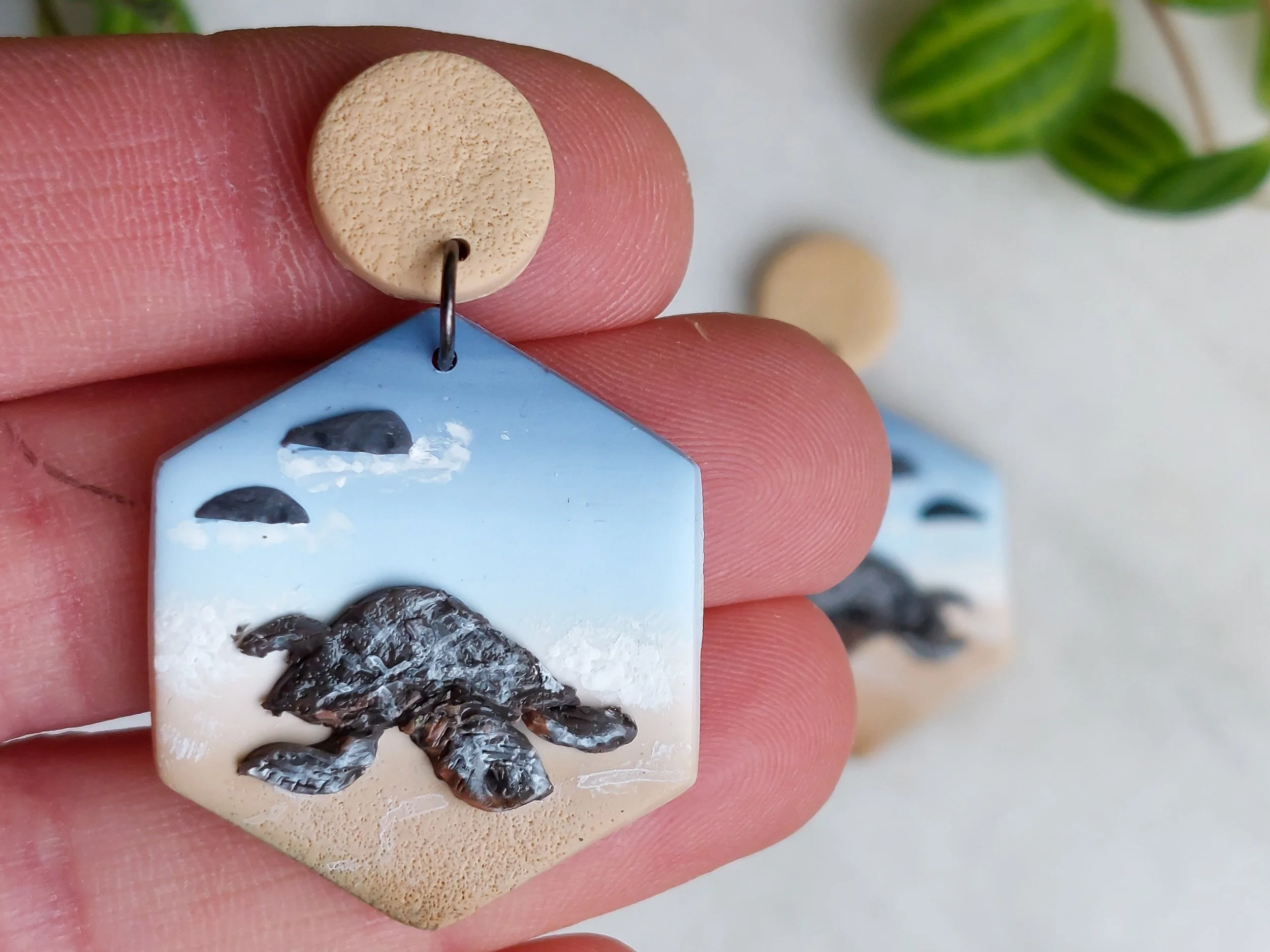 These Sea Turtle earrings are little artistic vignettes featuring tiny sea turtles that have been delicately sculpted and hand painted, emerging from the ocean on a sandy beach. Intricately detailed and one of a kind, they are a great gift for a budding marine biologist, sea turtle enthusiast, tide pool detective, beach lover, conservationist, teacher, friend, loved one, or yourself. The list goes on!